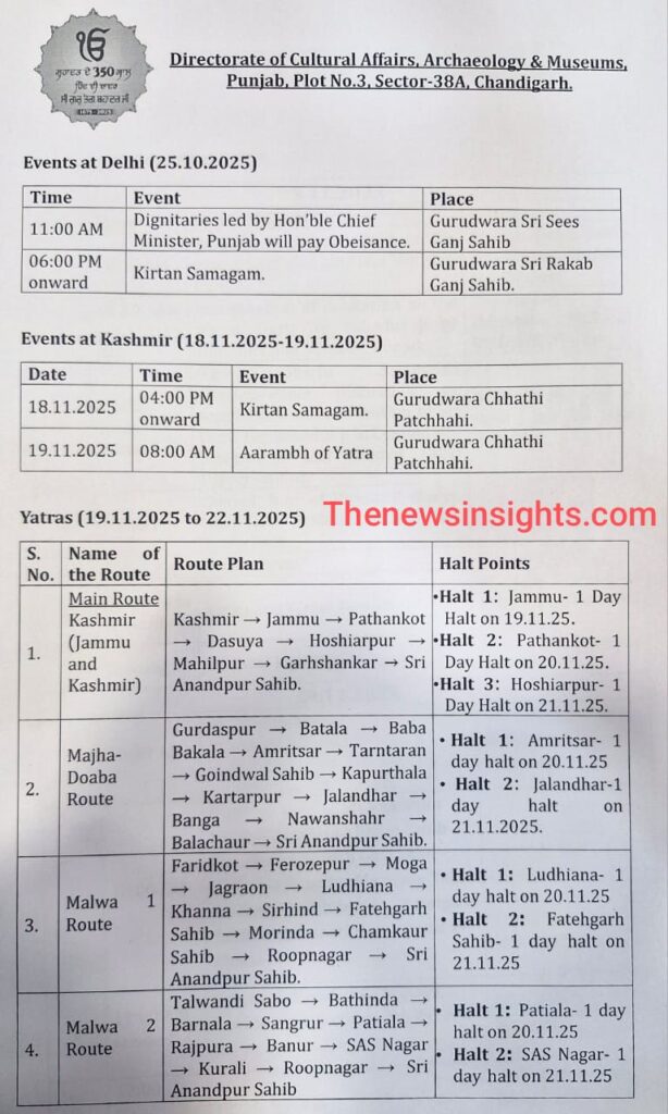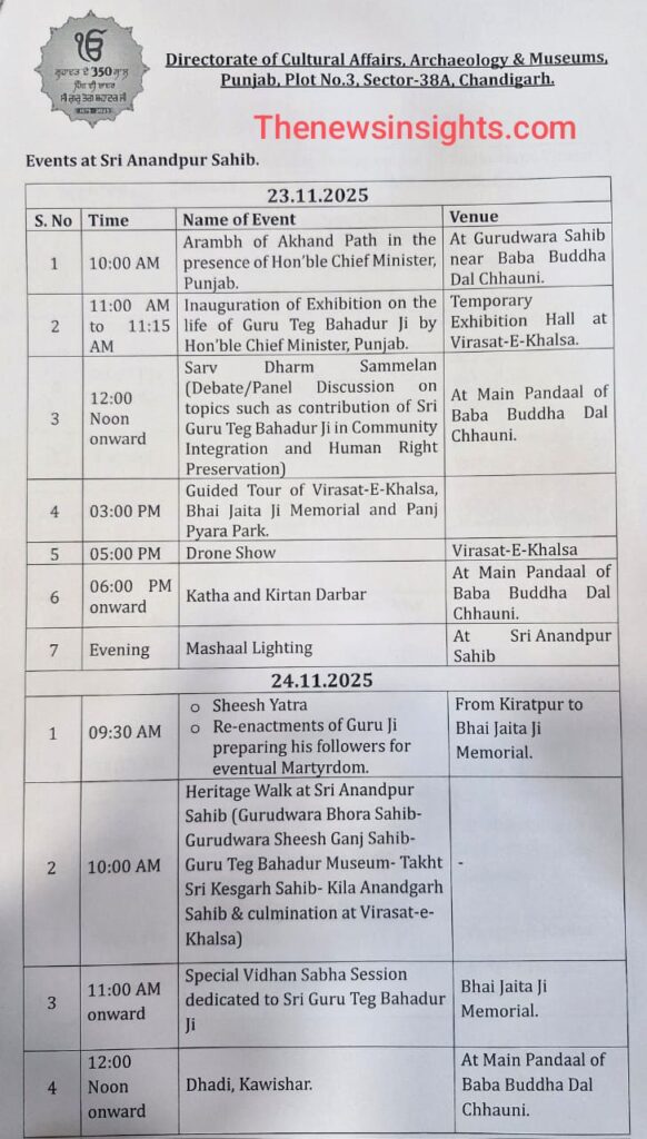 ਸ਼੍ਰੀ ਗੁਰੂ ਤੇਗ਼ ਬਹਾਦਰ ਸਾਹਿਬ ਜੀ ਦੇ ਸ਼ਹੀਦੀ ਪੁਰਬ ਮੌਕੇ ਹੋਣ ਜਾ ਰਹੇ ਪ੍ਰੋਗਰਾਮਾਂ ਦਾ ਵੇਰਵਾ ਹੇਠ ਲਿਖੇ ਅਨੁਸਾਰ ਹੈ:-