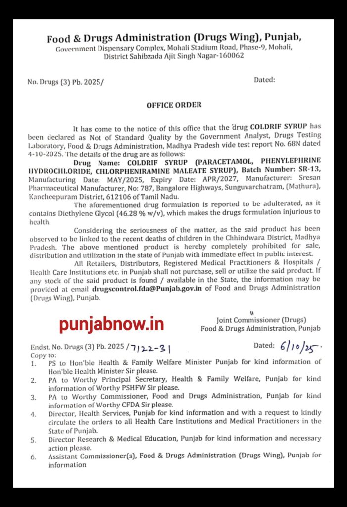 COLDRIF SYRUP Cough syrup ਦੇਸ਼ ਦੇ ਵਿੱਚ ਜਿਸ ਤਰ੍ਹਾਂ ਨਾਲ ਕਾਫੀ ਸਿਰਫ ਕਰਕੇ ਕਈ ਬੱਚਿਆਂ ਦੀ ਮੌਤ ਹੋ ਚੁੱਕੀ ਹੈ ਤਾਂ ਹੁਣ ਪੰਜਾਬ ਸਰਕਾਰ ਦੇ ਵੱਲੋਂ ਵੀ ਹੁਕਮਾਂ ਦੀ ਕਾਪੀ ਜਾਰੀ ਕਰ ਦਿੱਤੀ ਗਈ ਹੈ ।
