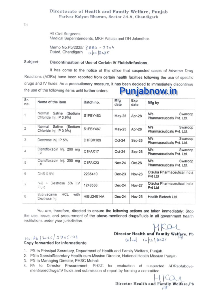 ਪਟਿਆਲਾ ਦੇ ਇੱਕ ਹੋਰ ਡਾਕਟਰ ਨੇ ਹੈਰਾਨੀ ਜਤਾਈ ਕਿ ਇਸ ਤਰ੍ਹਾਂ ਦਾ ਕੋਈ ਹੁਕਮ ਜਾਰੀ ਹੋਇਆ ਹੈ। ਦਿ ਟ੍ਰਿਬਿਊਨ ਦੇ ਕੋਲ ਮੌਜੂਦ 10 ਅਕਤੂਬਰ ਦੀ ਮਿਤੀ ਵਾਲੀ ਚਿੱਠੀ ਵਿੱਚ ਸਾਰੇ ਸਿਵਲ ਸਰਜਨਾਂ ਅਤੇ ਸਰਕਾਰੀ ਹਸਪਤਾਲਾਂ ਦੇ ਮੈਡੀਕਲ ਸੁਪਰਿੰਟੈਂਡੈਂਟਾਂ ਨੂੰ ਲਿਖਿਆ ਗਿਆ ਹੈ ਕਿ ਕੁਝ ਸਿਹਤ ਕੇਂਦਰਾਂ ‘ਚ ਵਿਸ਼ੇਸ਼ ਦਵਾਈਆਂ ਅਤੇ IV ਫਲੂਇਡ ਦੇ ਇਸਤੇਮਾਲ ਤੋਂ ਬਾਅਦ “ਸੰਭਾਵਿਤ ਪ੍ਰਤੀਕੂਲ ਪ੍ਰਭਾਵਾਂ” ਦੇ ਮਾਮਲੇ ਸਾਹਮਣੇ ਆਏ ਹਨ।
