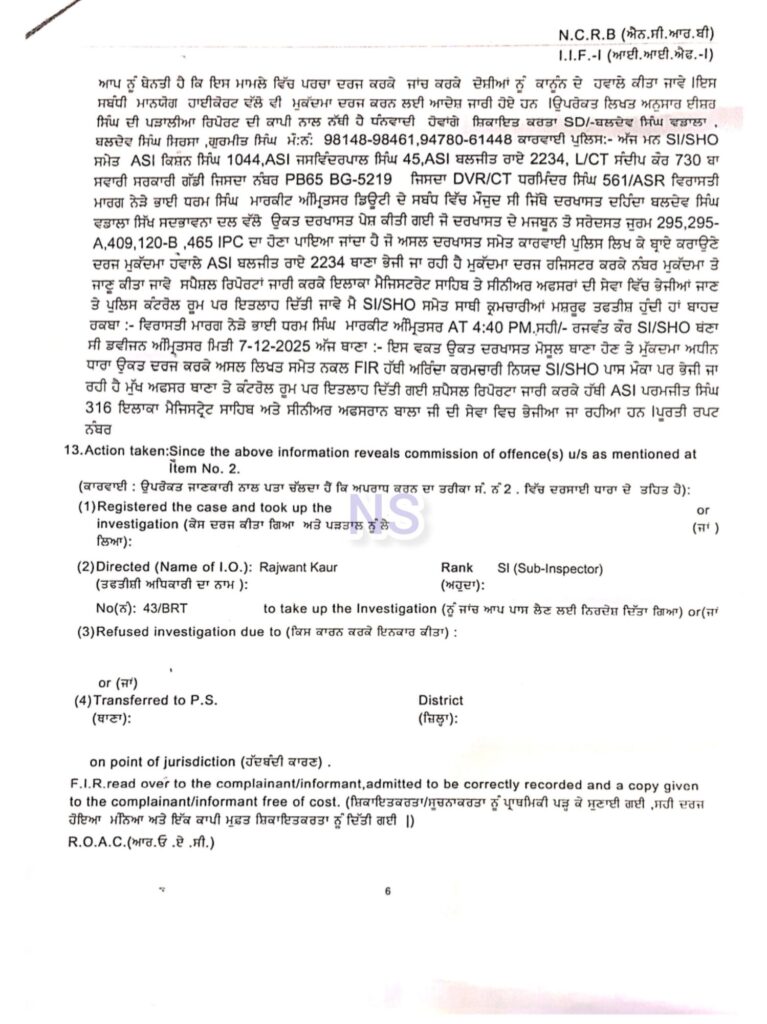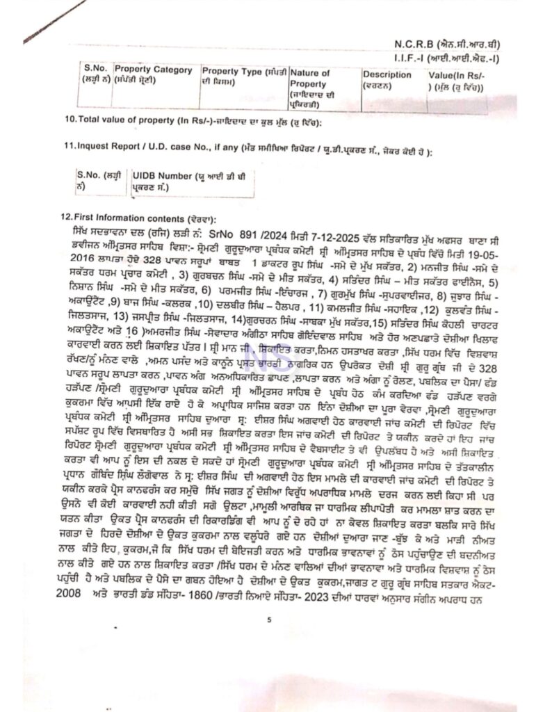 ਅੰਮ੍ਰਿਤਸਰ – ਸ਼੍ਰੀ ਗੁਰੂ ਗ੍ਰੰਥ ਸਾਹਿਬ ਜੀ ਦੇ ਲਾਪਤਾ ਹੋਏ 328 ਸਰੂਪਾਂ ਦੇ ਗੰਭੀਰ ਮਾਮਲੇ ਵਿੱਚ ਹੁਣ ਵੱਡੀ ਕਾਰਵਾਈ ਸਾਹਮਣੇ ਆਈ ਹੈ। ਪੰਜਾਬ ਪੁਲਿਸ ਵੱਲੋਂ ਇਸ ਮਾਮਲੇ ਵਿੱਚ 16 ਵਿਅਕਤੀਆਂ ਦੇ ਖ਼ਿਲਾਫ਼ FIR ਦਰਜ ਕੀਤੀ ਗਈ ਹੈ, ਜਿਨ੍ਹਾਂ ਵਿੱਚ ਸ਼੍ਰੋਮਣੀ ਗੁਰਦੁਆਰਾ ਪ੍ਰਬੰਧਕ ਕਮੇਟੀ (SGPC) ਦੇ ਉਸ ਸਮੇਂ ਦੇ ਮੁੱਖ ਸਕੱਤਰ ਅਤੇ ਕਈ ਹੋਰ ਉੱਚ ਅਧਿਕਾਰੀਆਂ ਦੇ ਨਾਮ ਵੀ ਸ਼ਾਮਲ ਹਨ।
